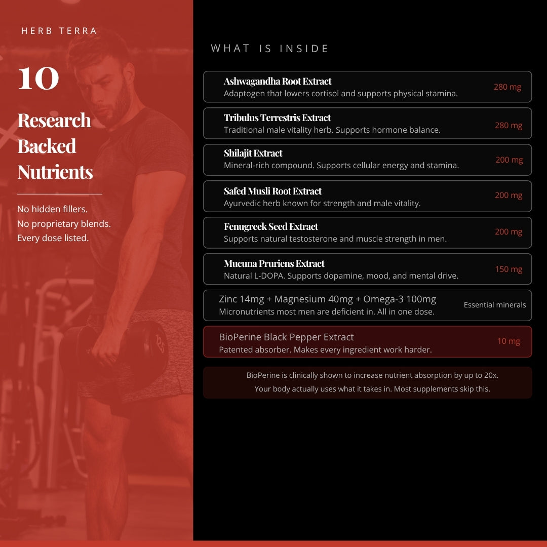 Most men's supplements contain just one or two herbs. Alpha Male Max combines 10 clinically-backed ingredients — Ashwagandha, Tribulus Terrestris, Shilajit, Safed Musli, Fenugreek, Mucuna Pruriens, Zinc, Magnesium, Omega-3, and BioPerine — that target energy, hormones, muscle, focus, and recovery simultaneously. Plus, BioPerine boosts absorption of every other ingredient by up to 2,000%.