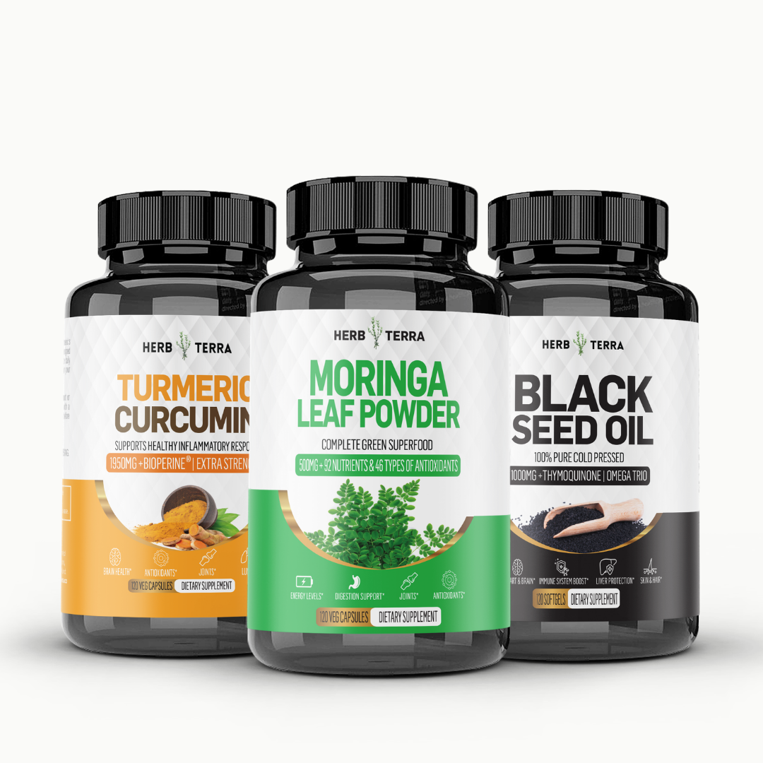 In today's fast-paced world, keeping your immune system resilient is more crucial than ever. Our Immunity Bundle Set combines nature’s most powerful immune-supporting elements to give you that extra layer of protection and vitality. The bundle includes three scientifically-backed supplements: Moringa Leaf, Turmeric Curcumin, and Black Seed Oil Capsules.