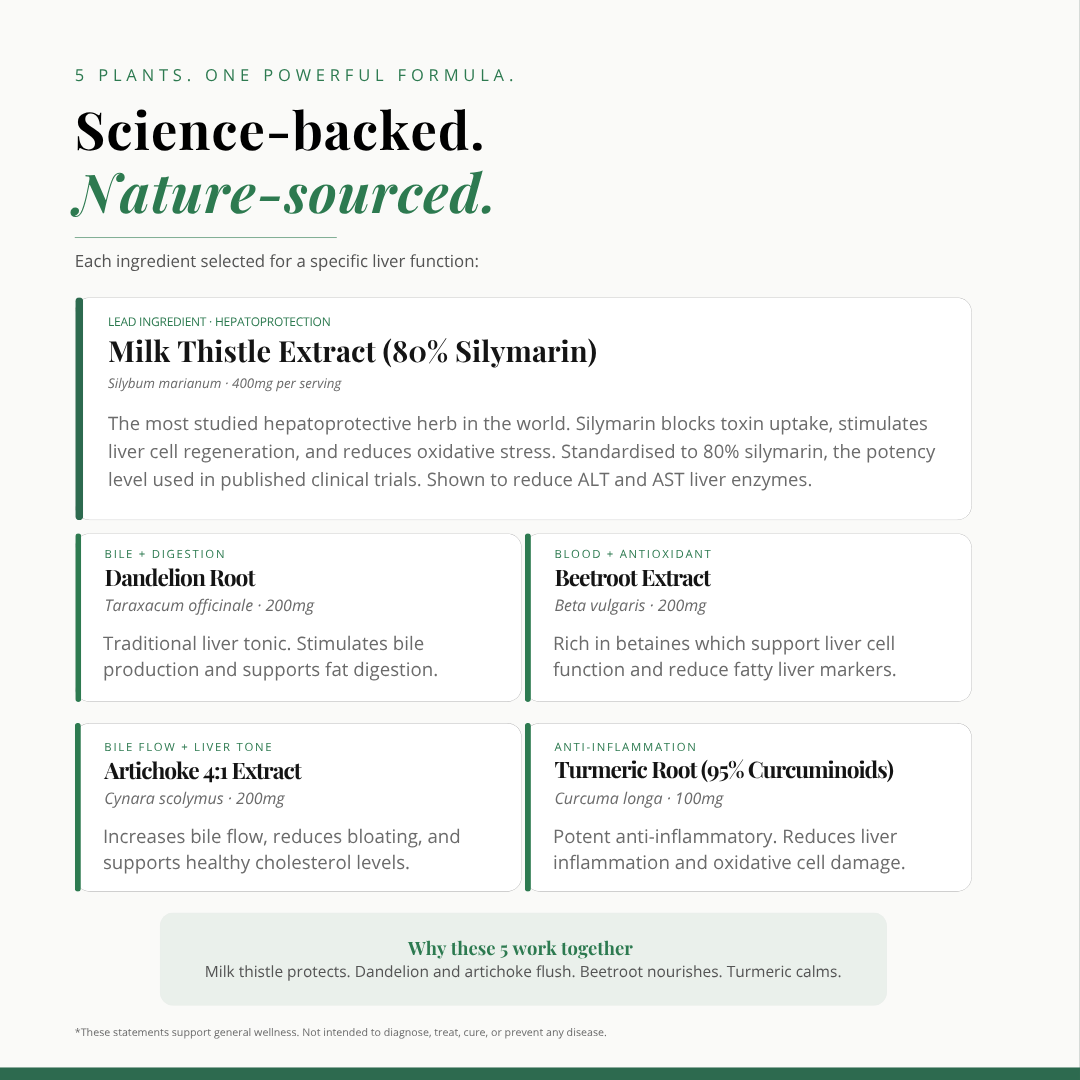 Milk Thistle and Turmeric provide powerful antioxidant support, shielding liver cells from damage while aiding detoxification processes. These ingredients work together to enhance your liver's ability to filter out toxins.